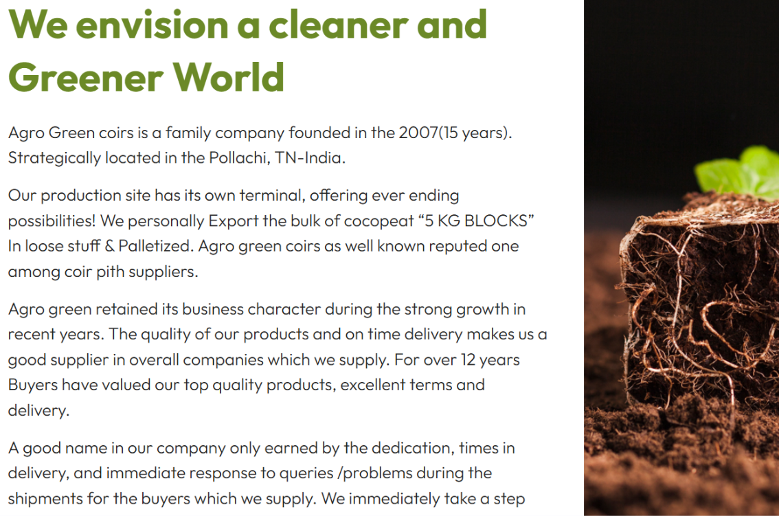 The website positions Agro Green Coirs as a knowledgeable, reliable supplier by clearly outlining its history, vision, and mission.