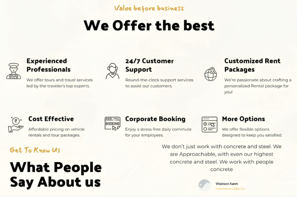 Transparency, GPS‑equipped vehicles, air‑conditioned service and experienced drivers are important features. We incorporated these into the About page using concise bullet points and repeated them as subtle icons on the Home page.