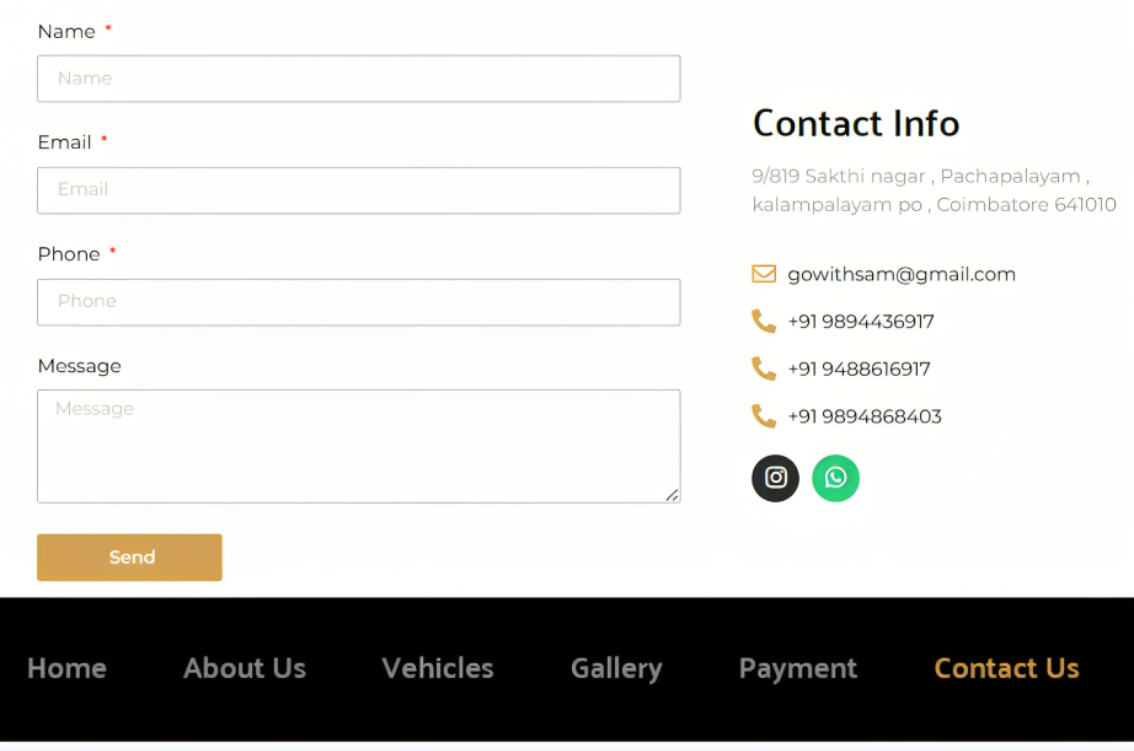 We avoided heavy booking plugins and instead built a straightforward “Book Now” form that captures name, contact details, the selected vehicle and travel dates. This information is emailed directly to their team for follow‑up. The site also integrates a WhatsApp chat button for quick queries.